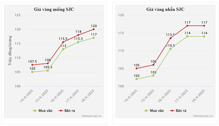Kết phiên 18/4, giá vàng miếng tại SJC đóng cửa ở mức 117-120 triệu đồng/lượng (mua vào - bán ra), tăng 1,5 triệu đồng/lượng ở chiều mua vào và đắt hơn 2 triệu đồng/lượng ở chiều bán ra so với chốt phiên giao dịch hôm trước.