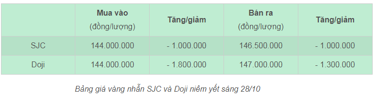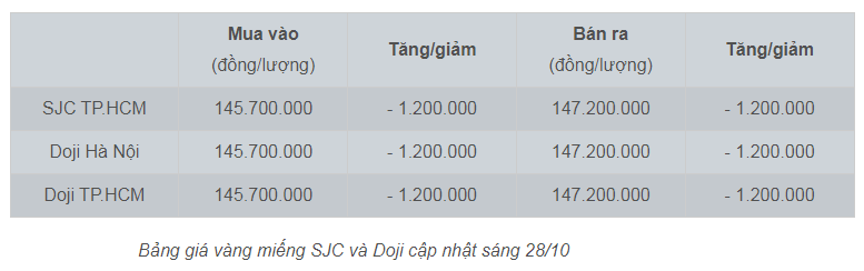 Mở cửa phiên giao dịch 28/10, giá vàng miếng SJC được điều chỉnh giảm 1,2 triệu đồng/lượng ở cả chiều mua vào và bán ra so với mức chốt hôm qua, xuống mức 145,7-147,2 triệu đồng/lượng (mua - bán).