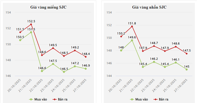 Phiên giao dịch 27/10, giá vàng miếng SJC đóng cửa ở mức 146,9-148,4 triệu đồng/lượng (mua - bán), giảm 300.000 đồng/lượng ở chiều mua vào và 800.000 đồng/lượng ở chiều bán ra so với chốt phiên giao dịch cuối tuần qua.