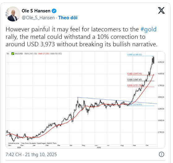 Ole Hansen, Trưởng phòng Chiến lược Hàng hóa tại Ngân hàng Saxo, cho biết trong một bài đăng trên mạng xã hội rằng giá vàng có thể giảm xuống mức thấp nhất là 3.973 đô la mà không ảnh hưởng đến xu hướng tăng dài hạn.